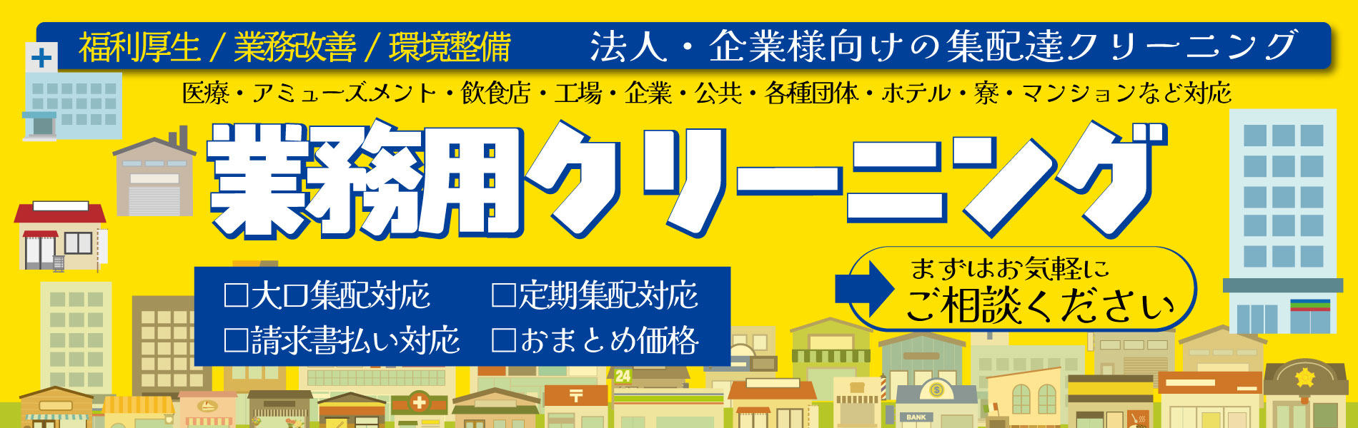 病院・学校・商店街・幼稚園・保育園・事務所・工場・レストラン・ホテル・パチンコ店などあらゆる法人様向けのクリーニングも承っています。お仕事で着られるユニフォームや帽子などの衣類をはじめ、シーツ、タオル、テーブルクロスなども大量にクリーニングに出していただくことが可能です。ご利用の量に応じて、週1回から毎日まで、集配つきでクリーニングさせていただきます。